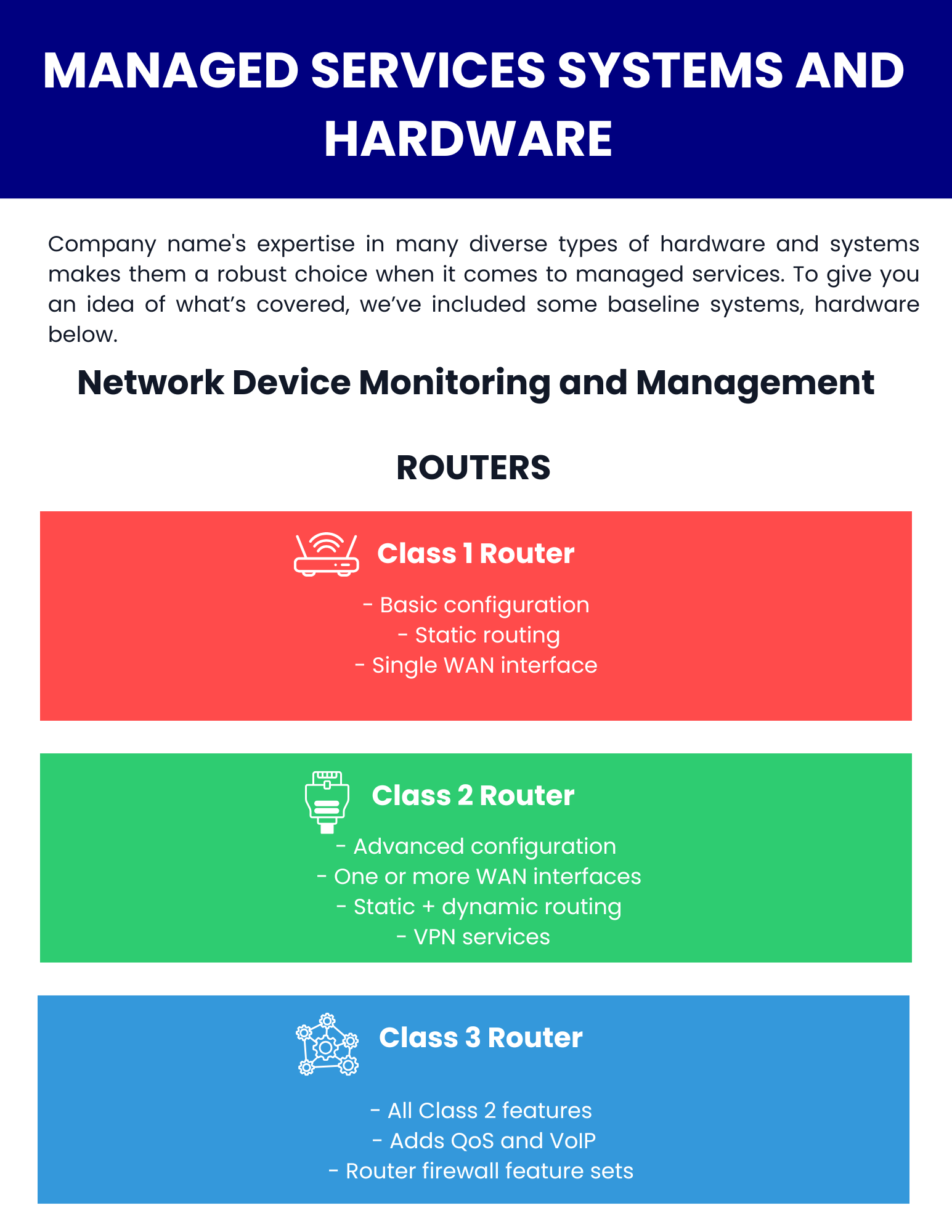 This redesign modernized a corporate managed-services document, transforming dense technical content into a clean, scannable layout that improves comprehension and visual appeal.