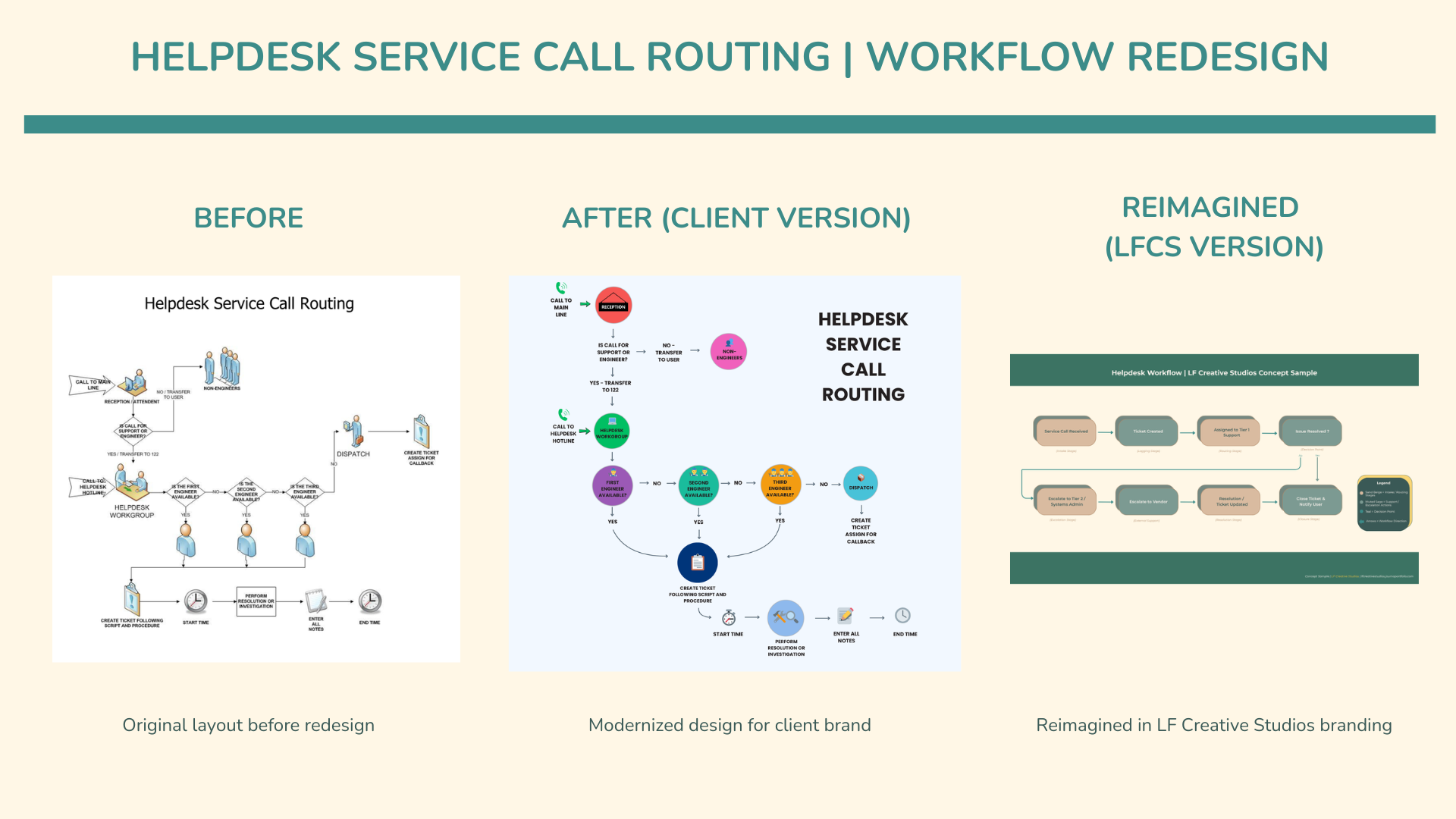 A before-and-after transformation of a complex Helpdesk process into a clear, branded workflow system. This project blends technical structure with design clarity to make process documentation easy to follow and visually engaging.
